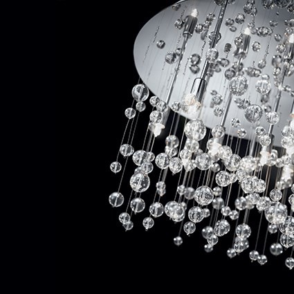 Extravagante Leuchte aus einem hochwertigen Metallkörper mit verchromter Oberflächenbehandlung, an dem Pendel aus Glaskugeln aufgehängt sind, die an einer Nylonschnur aufgereiht sind.